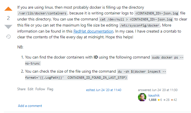Entry to Insert – */30 * * * truncate -s 0 /var/lib/docker/containers//-json.log >/dev/null 2>&1