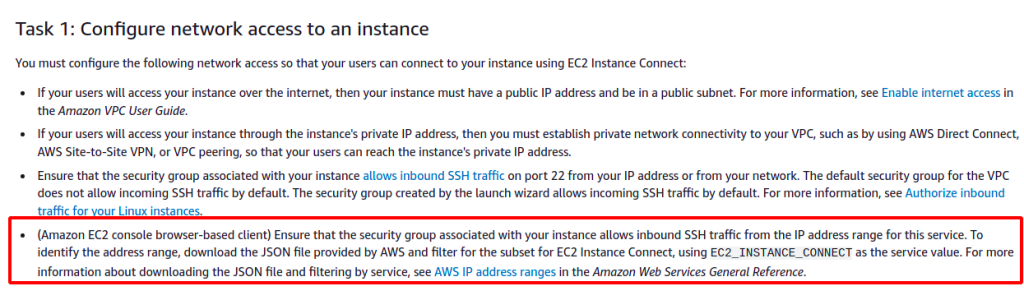 Today I needed to identify what IP ranges need to be added in security groups that allow EC2 Instance Connect to be able to establish a connection to a node.